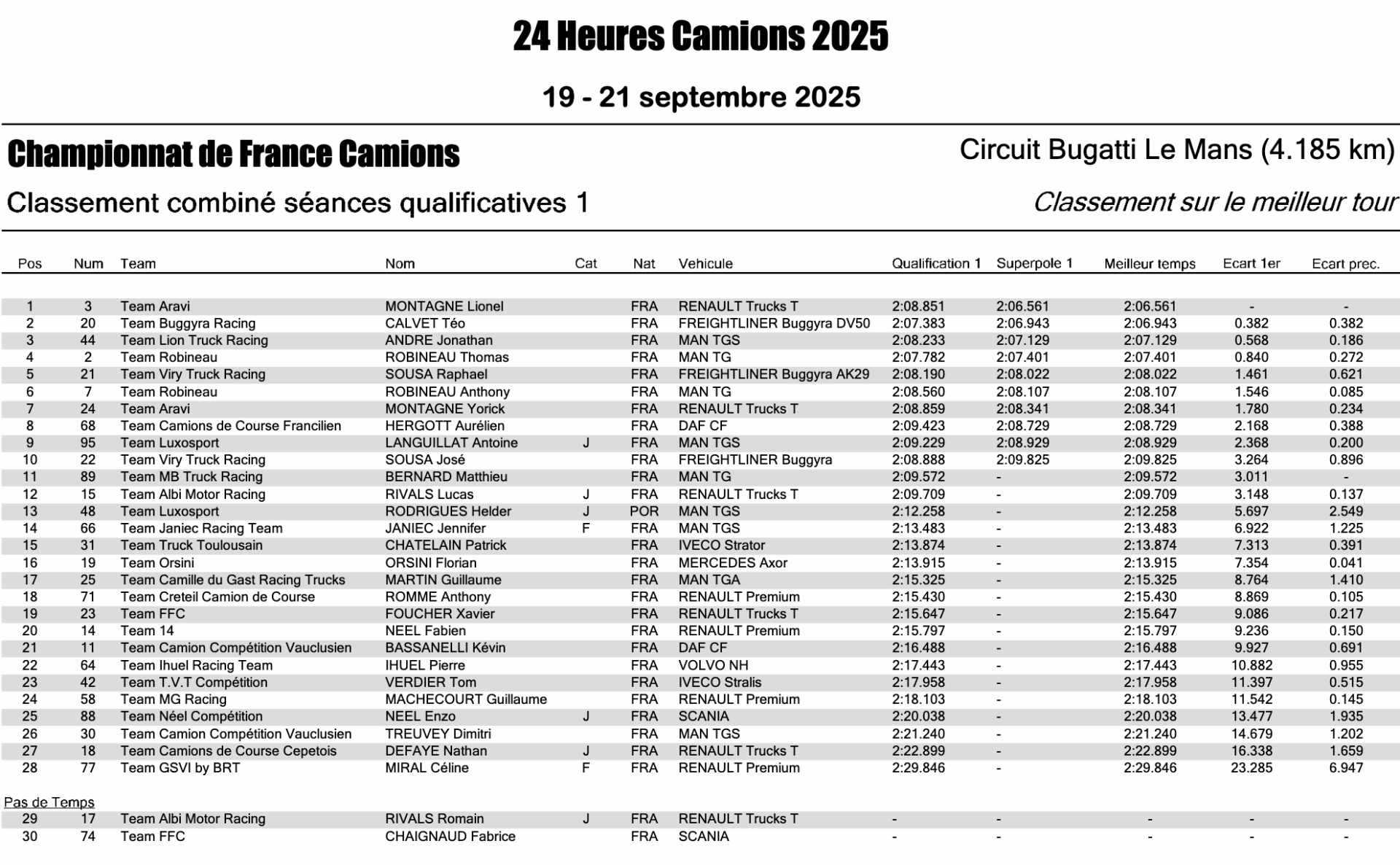Parmi les autres « rookies » du championnat de France Camions FFSA 2025, Fabien Néel (#14 – Renault), Guillaume Machecourt (#58 – Renault) et Enzo Néel (#88 – Scania) terminent respectivement 20e, 24e et 25e. Un résultat plus qu’honorable pour une toute première apparition sur le mythique circuit Bugatti du Mans. La deuxième féminine du plateau, Céline Miral (#77 – Daf), retrouve enfin le volant après une longue absence due à une blessure au dos. Pour son retour, elle signe le 28e chrono. À noter que Fabrice Chaignaud (#74 – Scania) et Romain Rivals (#15 – Renault) n’ont, eux, pas pu boucler le moindre tour.