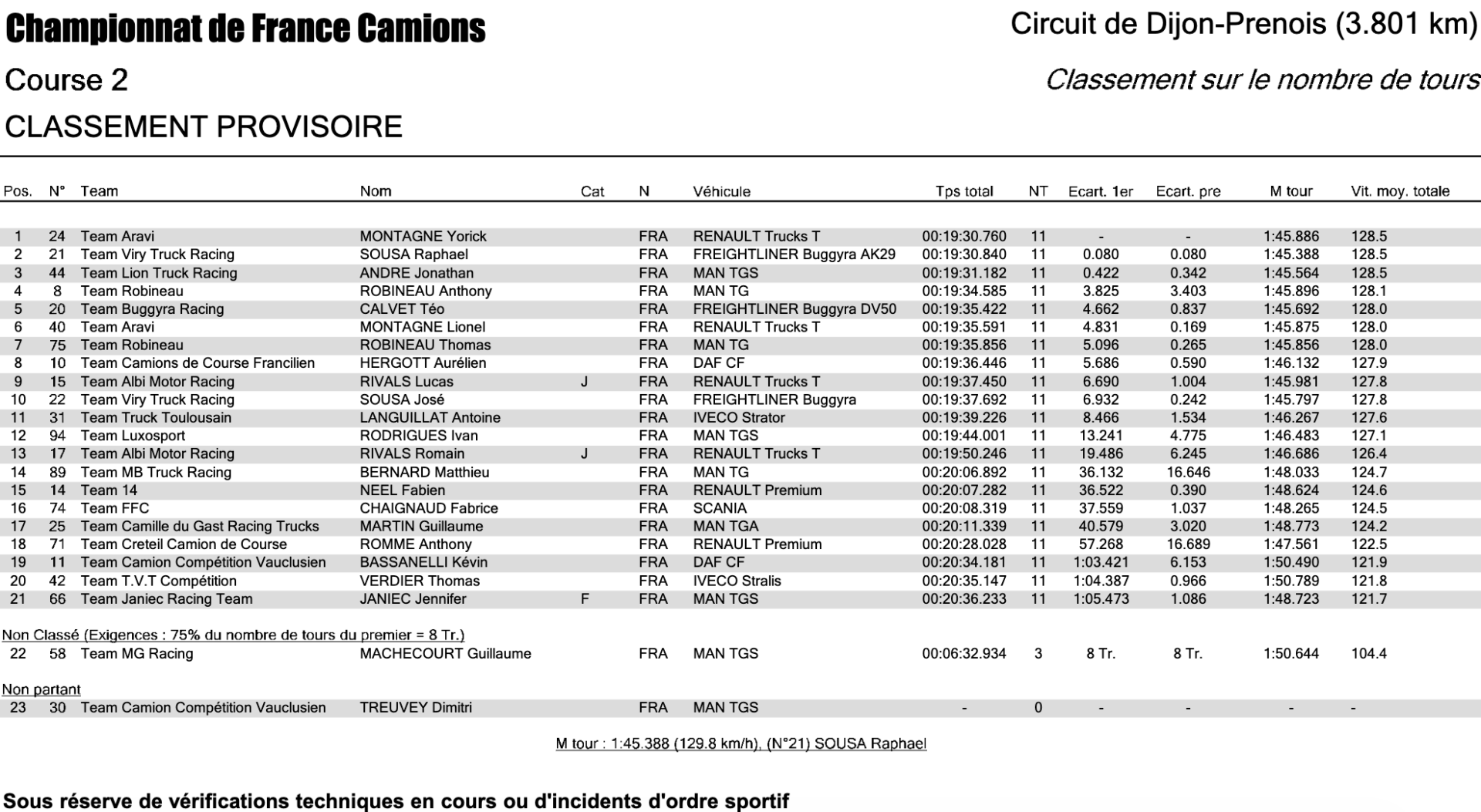 Si la bagarre a été intense en tête de course, elle l’a été tout autant en milieu et en fond de peloton. Malheureux lors de la course 1 (abandon), Matthieu Bernard (#89 – MAN) est parti depuis le fond de grille et a réalisé une belle remontée jusqu’à la 14e place. Mais il a dû se battre jusqu’au damier face à Fabien Néel (#14 – Renault), finalement quinzième, tandis que Fabrice Chaignaud a terminé dans leur sillage. Une belle passe d’armes a également opposé Guillaume Martin (#25 – MAN) à Anthony Rommé (#71 – Renault), sans qu’aucun des deux ne parvienne réellement à prendre le dessus durablement. Plus loin, Kévin Bassanelli (#11 – Daf) et Thomas Verdier (#42 – Iveco) ne se sont pas lâchés d’un pare-chocs pour le gain de la 19e place, dans un duel serré jusqu’à l’arrivée. Jennifer Janiec (#66 – MAN) ferme la marche du classement. À noter l’abandon de Guillaume Machecourt (#58 – MAN), contraint de renoncer en cours d’épreuve.