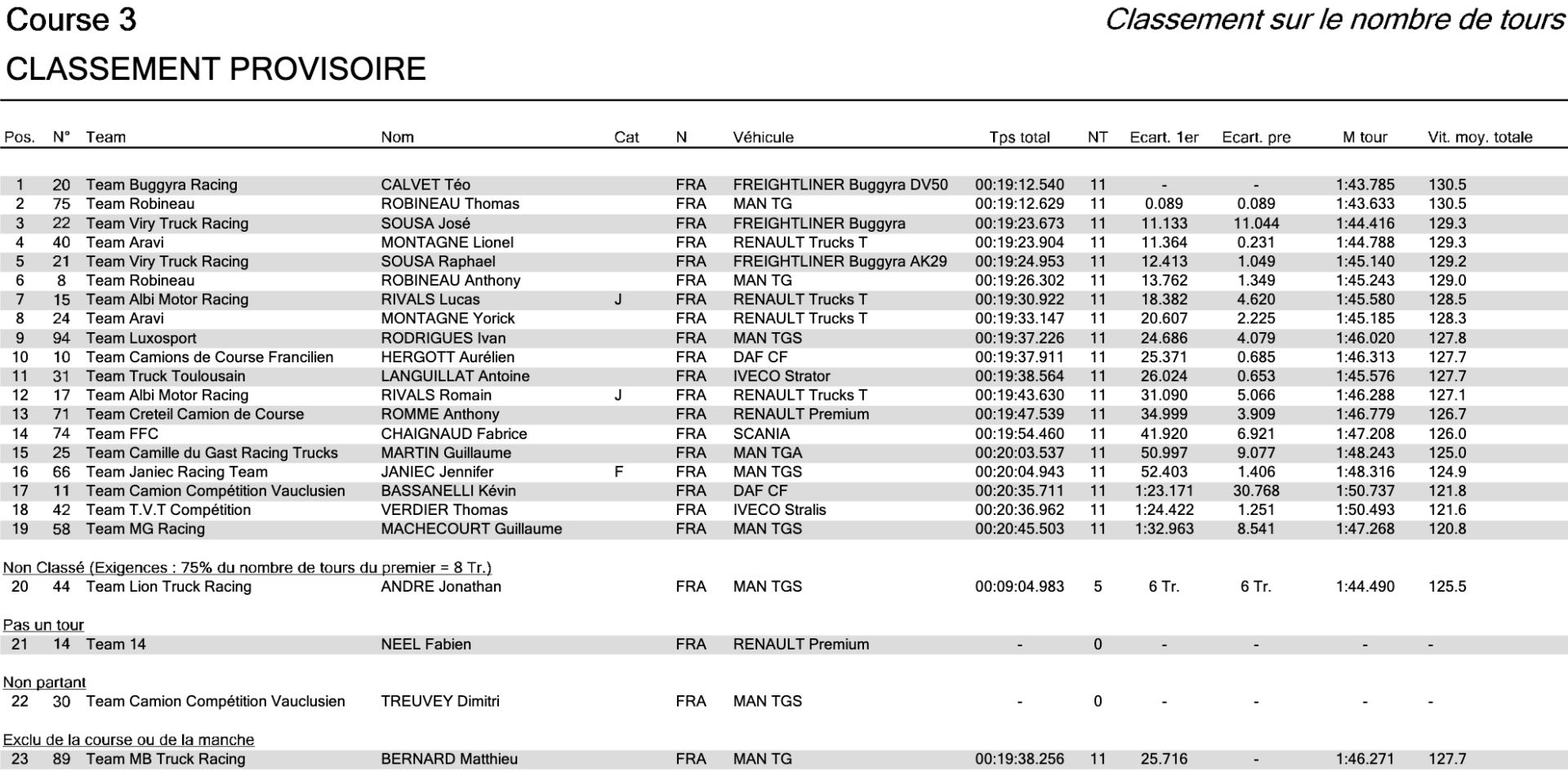 Longtemps quatrième, José Sousa (#22 – Freightliner) récupère la troisième place après l’abandon de Jonathan André (#44 – MAN), victime d’un problème mécanique alors qu’il se dirigeait vers un nouveau podium. Un coup dur pour le pilote du Lion Truck Racing, qui restait sur deux top3 consécutifs et laisse filer de gros points. Sousa, opportuniste, monte sur la boîte après avoir résisté aux attaques de Lionel Montagne (#40 – Renault) dans les premiers tours avant de creuser un léger écart. Derrière le top 4, on retrouve Raphaël Sousa (#21 – Freightliner) et Anthony Robineau (#8 – MAN), légèrement esseulés. Pour sa part, Lucas Rivals (#15 – Renault) a vécu une course en solitaire (7e). Si la tête de course se fige rapidement, la bataille a fait rage pour la huitième place, toujours stratégique puisqu’elle offre la pole position pour la course suivante. Longtemps en position favorable, Ivan Rodrigues (#94 – MAN) cède finalement face à Yorick Montagne (#21 – Renault). Une manœuvre décisive qui permet à ce dernier de s’élancer en tête de la quatrième manche, avec Lucas Rivals (#15 – Renault) à ses côtés en première ligne.