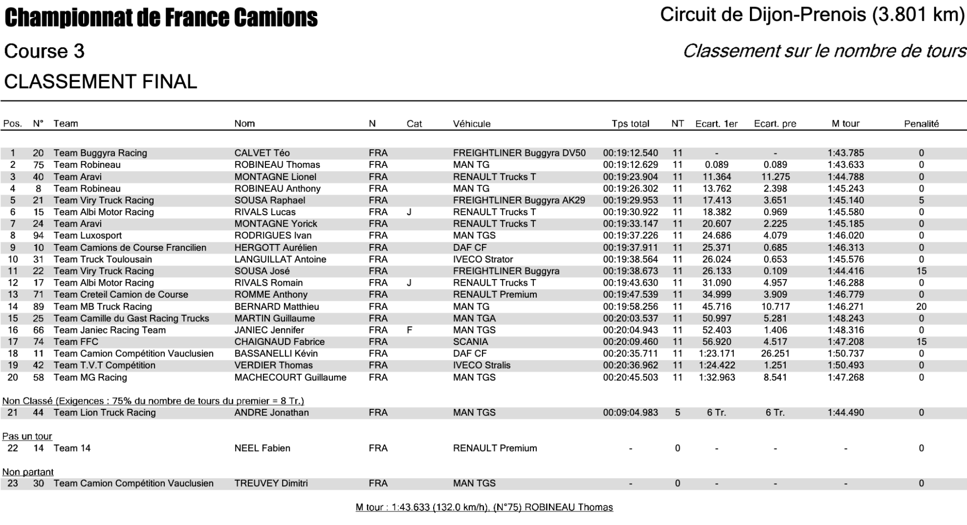 Course 3 intense et haletante à Dijon, où Téo Calvet (#20 – Freightliner) impose une nouvelle fois sa loi. Le champion en titre s’impose au terme d’un duel exceptionnel face à Thomas Robineau (#75 – MAN) avec une arrivée à couper le souffle.