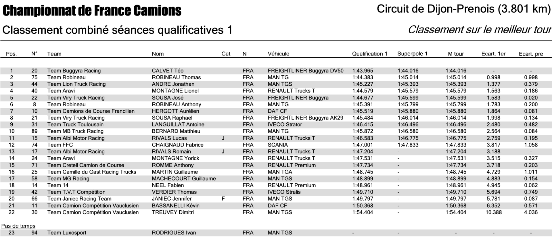 Matthieu Bernard (#89 – MAN) avait montré de belles choses l’an passé au volant d’une nouvelle machine. Il confirme en se hissant au 10e rang. Lucas Rivals (#15 – Renault), qui développe un nouveau moteur “maison”, se classe 11e. Le travail semble porter ses fruits, ce qui est prometteur pour la suite. Enfin, un grand bravo à Fabrice Chaignaud (#74 – Scania), qui, malgré un manque de puissance face à ses concurrents, se classe 12e. C’était déjà une victoire en soi de rallier la superpole au vu du niveau de compétitivité du plateau. Évidemment, le premier déçu des qualifications en général est Romain Rivals (#17 – Renault), qui échoue aux portes de la superpole (13e). On attendait également mieux de la part de Yorick Montagne (#24 – Renault), “seulement” 14e. Après une année de pause pour cause de paternité, Ivan Rodrigues (#94 – MAN) imaginait sûrement un meilleur retour à la compétition. Malheureusement, pénalisé pour excès de vitesse, il partira depuis le fond de la grille de la course 1, dont le départ sera donné à 13h45.